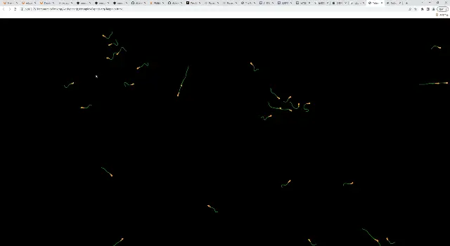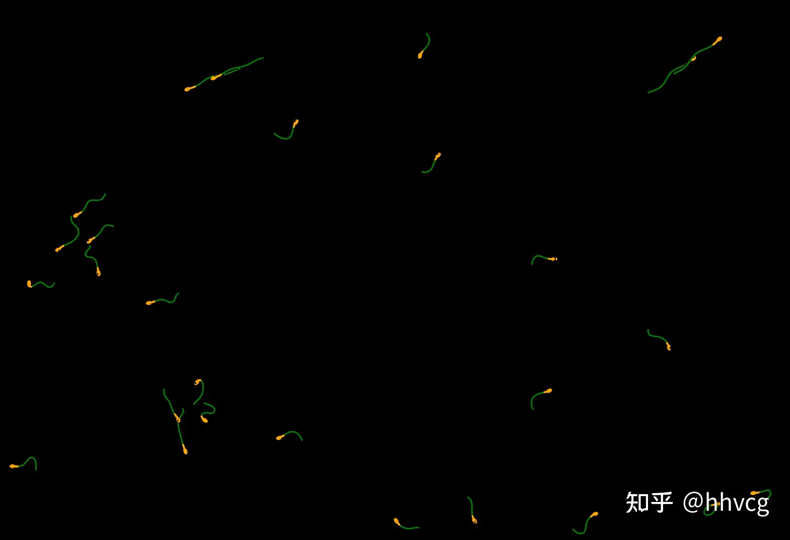 界面中的每一个小蝌蚪,彷佛有生命般的在”自由“运动,他们长得一样,身体的结构都是由一个头,一个颈部和一个尾巴组成,但是各自都有各自的运动方向,及运动速度,同时还添加了类似碰撞检测的机制。这模仿的效果,相当的惊艳。